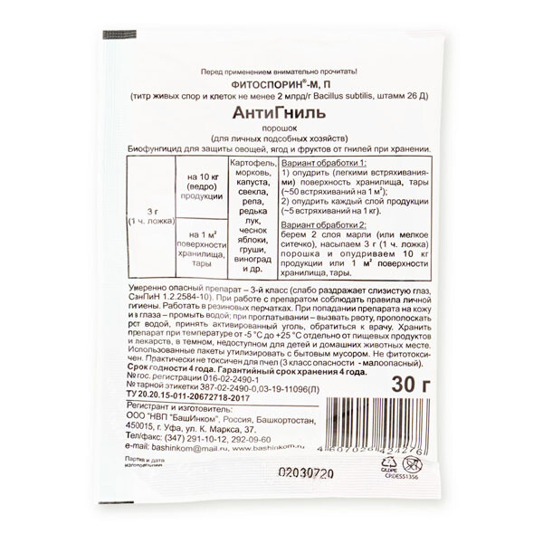 Препарат для защиты от гнили фруктов, овощей и ягод при транспортировке или хранении. Средство относится к группе биофунгицидов, которые разработаны на основе бактерий. С помощью "АнтиГнили" продлеваются сроки хранения сельскохозяйственной продукции в 1,5-2 раза.
