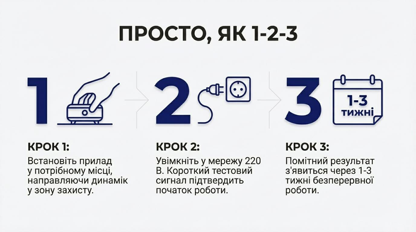 Результат заметен через 1-3 недели регулярного использования. Прибор можно включать несколько раз в неделю для профилактики. При повторном появлении вредителей цикл обработки следует повторить.