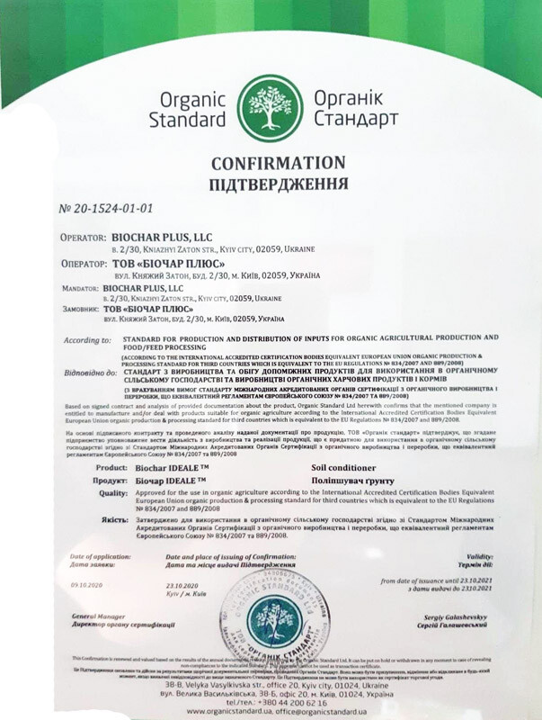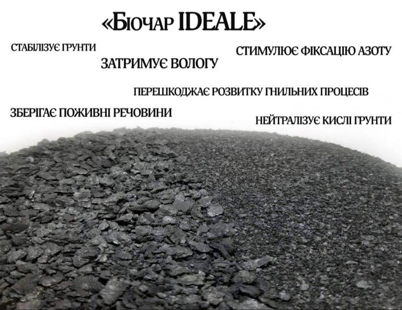 Біочар IDEALE на 92-96% складається із вуглецю. Елемент притягує іони корисних хімічних елементів, насичуючи ними ґрунт. Шкідливі домішки Біочар абсорбує за принципом активованого вугілля.