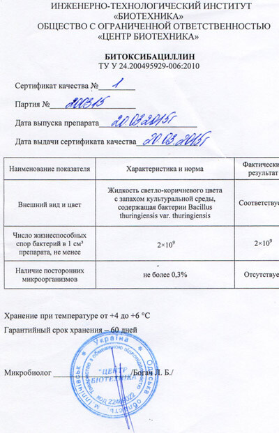 Виробник: Національна академія аграрних наук України, спільне виробництво ІТІ «Біотехніка» та ТОВ «Центр Біотехніка».