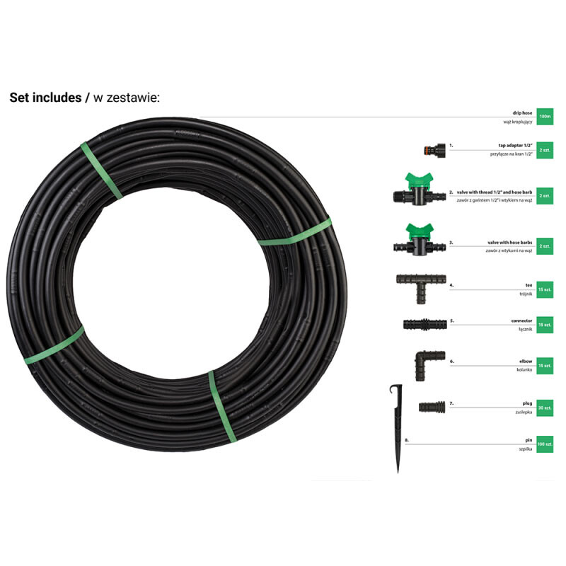 Якщо потрібен крапельний полив для городу, теплиці, полуниці або овочевих грядок - це той формат, який запускається за один вечір. У комплекті вже є крапельний шланг 16 мм на 100 м і основні фітинги: підключення до крана, розгалуження, заглушки та кілочки для фіксації лінії.