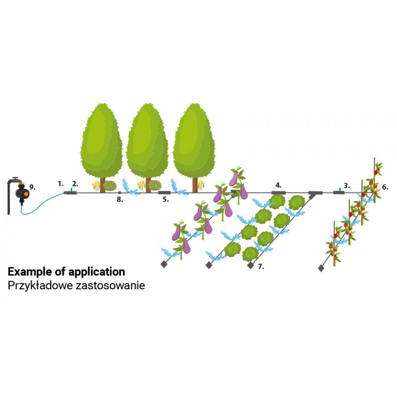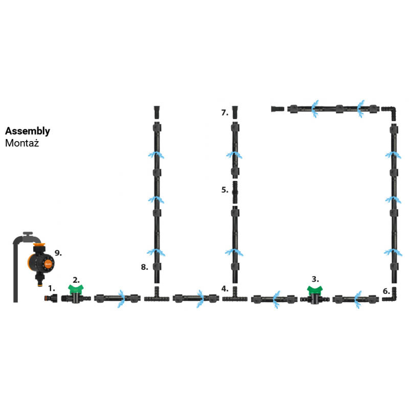 Гнучке складання під вашу схему посадок. Розгалуження, кути та завершення лінії робляться фітингами з комплекту - зручно, коли грядки різної довжини або теплиця розбита на зони.
