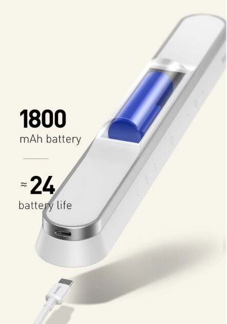 Автономна світлодіодна лампа Baseus оснащується акумуляторною батареєю ємністю 1800 мА·год. Працює від 4 до 24 годин, залежно від інтенсивності світлового потоку.