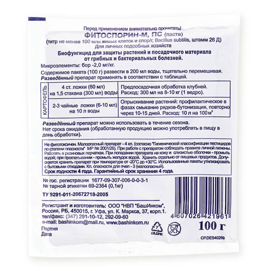 Фітоспорин-М Картопля – біологічний фунгіцид широкої дії. В основі препарату природні фітобактерії у формі спорової культури – Bacillus subtilis 26 Д + гумати Гумі + Бор.