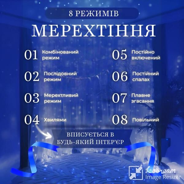 Гірлянда пропонує 8 режимів роботи, перемикатися між якими можна за допомогою контролера, завдяки чому є можливість вибору підсвічування залежно від настрою чи тематики заходи.