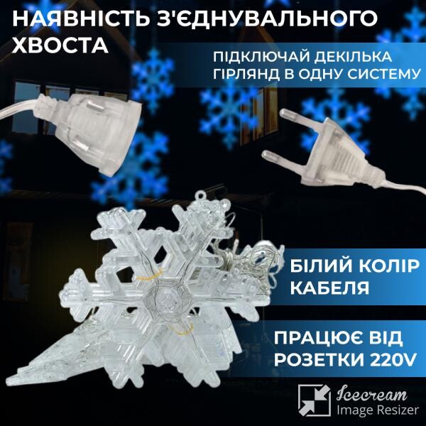 Дванадцять мерехтливих фігур зірок та сніжинок гірлянди "Зірки та сніжинки" створюють чарівну атмосферу казки та затишку. Гірлянду можна повісити на вікно, щоб утворити святкову атмосферу. Прикрасити нею стіну чи камін, щоб додати сяйва.