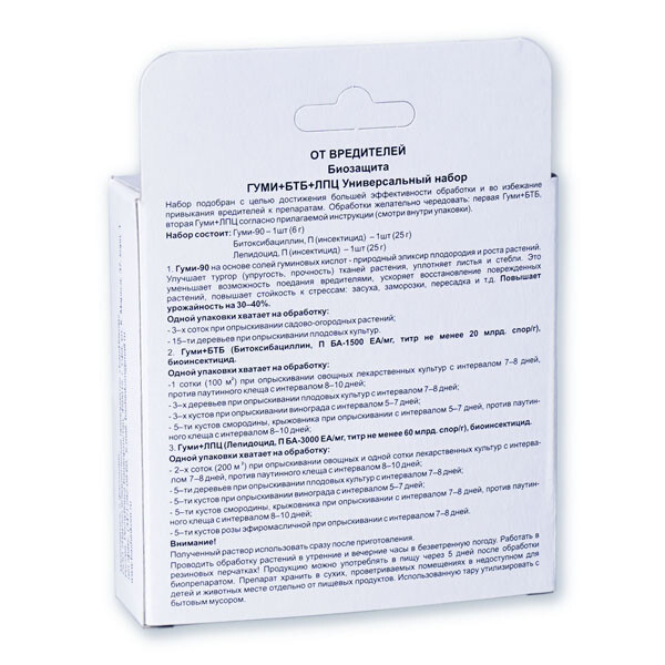 Набор состоит из 3-х биопрепаратов для достижения максимальной эффективности обработок. Живые бактерии Битоксибациллина и Лепидоцида воздействуют на 15+ самых распространенных вредителей растений. Экстракт природных гуматов "Гуми" служит эффективным удобрением.