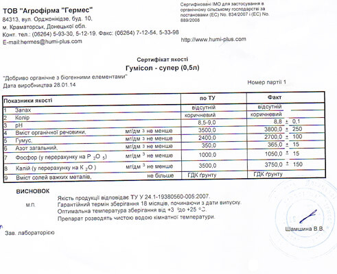 Товар сертифицирован IMO (Швейцария) для применения в органическом сельском хозяйстве по директивам ЕС №834/2007 и (ЕС) №889/2008.