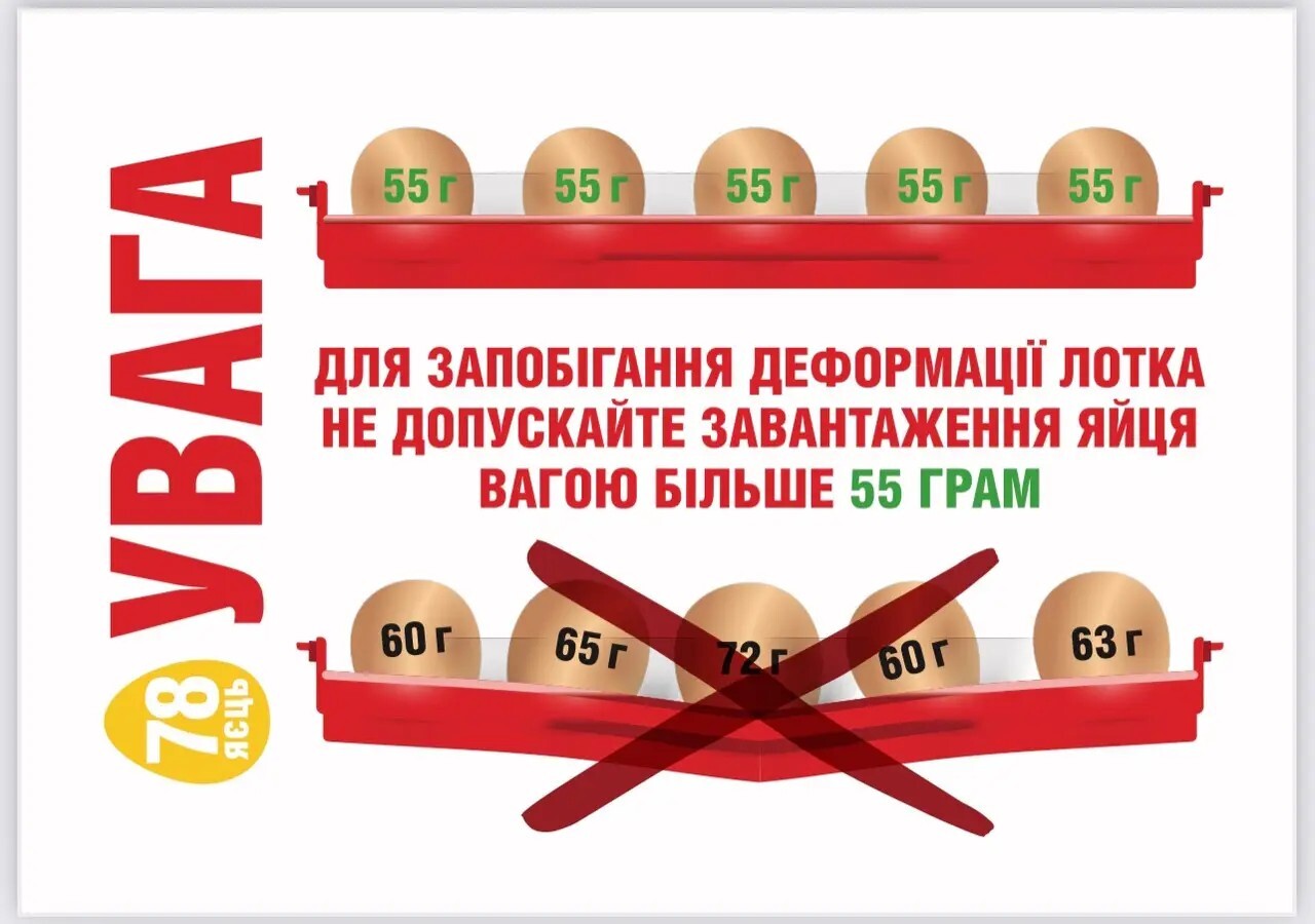Для запобігання деформаціїї лотка не допускайте завантаження яйця вагою більше 55 грам !