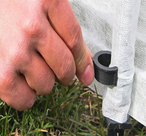 Кілочки вбивають у ґрунт по периметру грядки. Далі на опори натягують агроволокно або інший матеріал, що підходить для цієї мети, і фіксують його кліпсами.