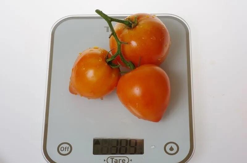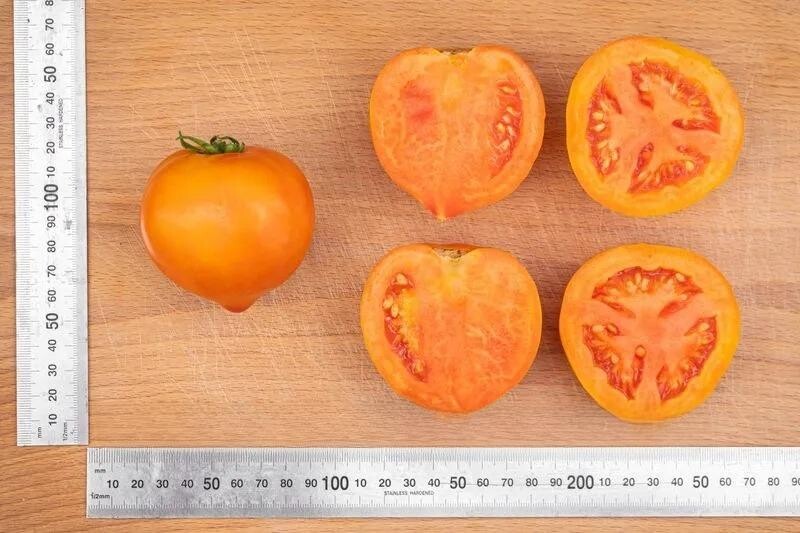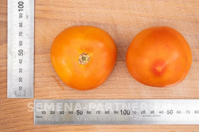 Плоди округлі, з акуратним носиком, масою 200-220 г. Забарвлення насичено-помаранчеве, що надає плодам привабливого товарного вигляду. Томати щільні, із товстими стінками та соковитою ароматною м’якоттю. Завдяки таким властивостям гібрид універсальний: однаково добре підходить для салатів, цільноплідного засолювання та консервування.