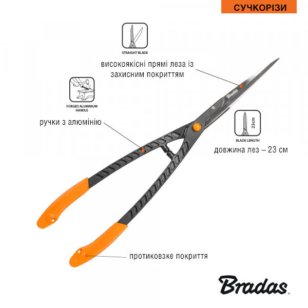Ножиці для формувального обрізання кущів. Виготовлені із високоякісної сталі. Леза прямі вузькі із гострими кінчиками. Безпеку рук забезпечують буфери замикання. На ручках антиковзкі накладки.