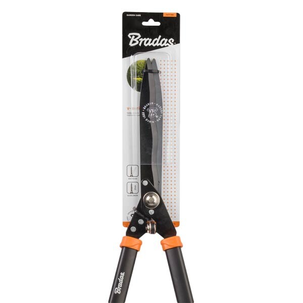 Садові ножиці KT-V1121 з хвилястими лезами зі сталі марки SK-5 розроблені для стрижки кущів та формування живоплотів. Леза виконані у звивистій формі. Матеріал — загартована сталь високої якості із захисним покриттям. Фіксатори та регульований затискний гвинт запобігають надмірному навантаженню на леза.