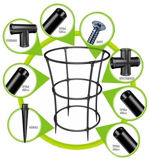 Опора существенно облегчает формирование кроны цветов и декоративных растений. Состоит из пластмассовых трубок, соединенных между собой специальными соединителями. В разобранном состоянии опора легкая и малогабаритная, ее очень просто транспортировать. Доступно и быстро собирается и разбирается своими руками!