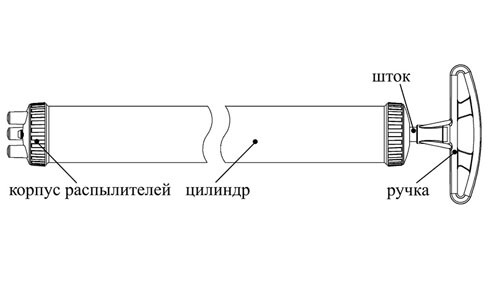 Готовый раствор закачивается в опрыскиватель садовый ручной  при помощи рукоятки. Нажатием "от себя" создается давление и жидкость в распыленном виде под давлением вырывается наружу.