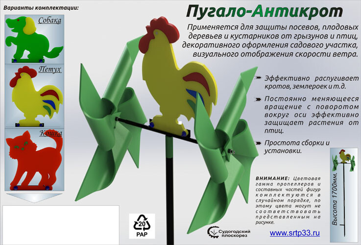 Отпугиватель надежно защитит участок от непрошеных гостей, которые любят полакомиться с трудом полученным урожаем - кротов, землероек, грызунов и птиц. А еще - это флюгер, который покажет направление ветра и послужит прекрасным украшением участка на радость вам и внукам.