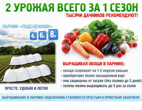 «Подснежник» - новое слово в удобстве установки, легкости конструкции и долговечности материалов парника. Защищает растения от заморозков, жары, перепадов температур, ливней, град, а также нашествия насекомых и птиц. С парником вы получите шикарный урожай ваших любимых овощей и зелени раньше соседей.