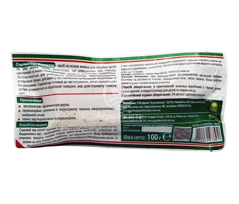 Рання весна, пізня осінь | Захист дерев під час обрізки або пошкоджень, а також при сонячних опіках | Садовий вар покласти на сонце або розігріти руками до утворення пластичної маси. Відрізати на упаковці кут і виштовхнути пасту, накласти на суху, очищену поверхню зрізу рівномірним шаром товщиною не більше 1-2 мм за допомогою дерев'яної лопатки, шпателя або руками. | Проводити при сухій погоді! Старі рани і тріщини слід попередньо очистити до живої тканини і обробити препаратом Пентафаг-С або Триходерміном, після чого покрити Садовим Варом. |
