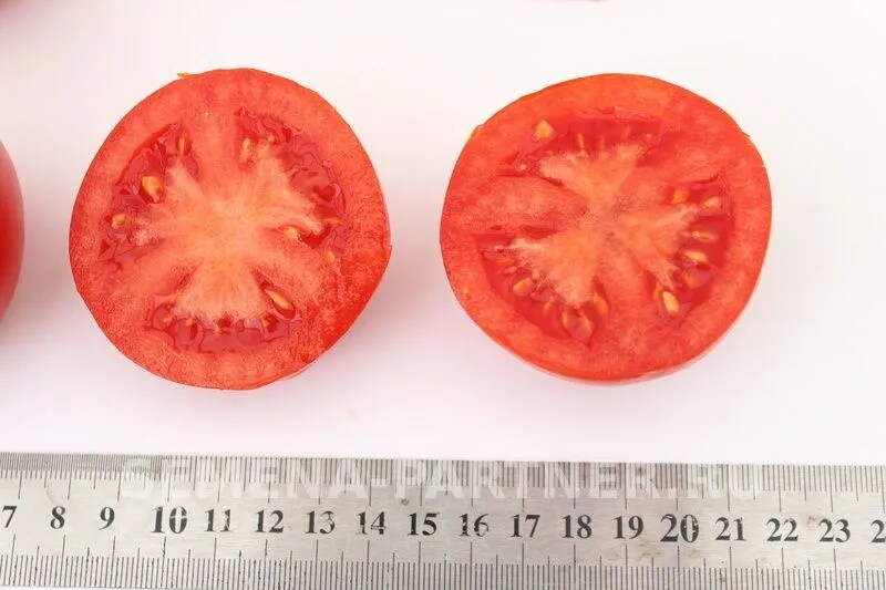 Томати густо-червоного кольору, дуже красиві, шкірка тонка, міцна, блискуча.