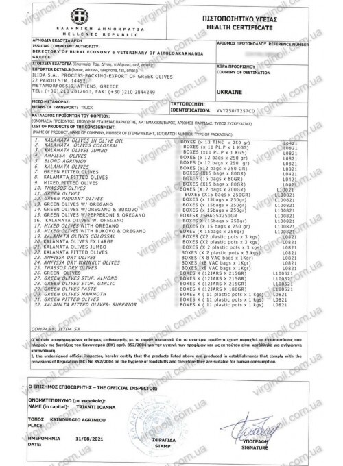 Вся продукція має грецькі сертифікати якості та справжності, упаковується на заводах виробника в Греції, вирощена в екологічно чистих умовах у найбільш сприятливих регіонах.