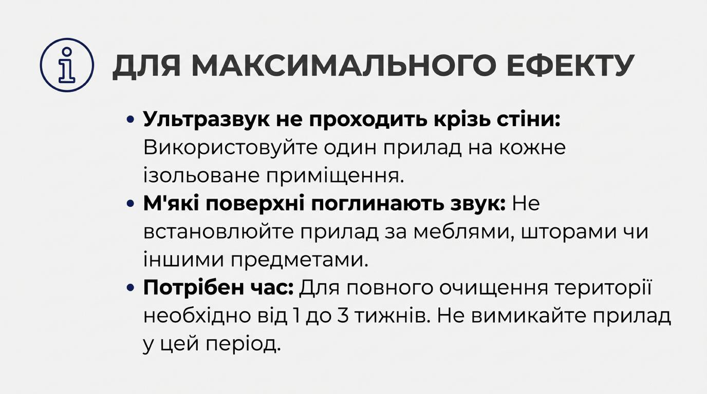 • Ультразвукова хвиля не поширюється крізь стіни та перекриття, а працює виключно в тому просторі, де встановлений відлякувач.